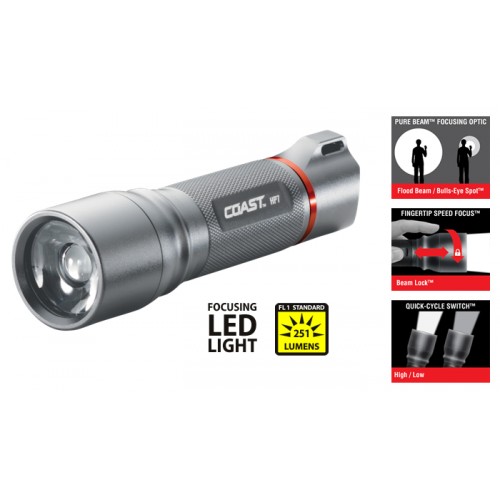 The Coast HP7 LED Flashlight is a great size that is easy to carry, and packs the light output and runtime that is needed by those that rely on their light every day. A quick cycle switch allows you to select between a high output setting of 251 lumens or a low output of 58 lumens allowing you to choose the right level for your application. Coast's Pure Beam Focusing Optic System with Fingertip Speed Focus Control provides superior beam consistency from spot to flood, with no dark rings typically associated with focusing flashlights, and you can lock the beam focus in any position you want with our Beam Lock System. The Bulls Eye spot beam pattern gives you a great focused spot with a maximum beam distance of 196 meters (642 feet), while producing an outer ring of flood light which allows you to see a broader area to the sides. Built tough, an impact-resistant, lightweight aluminum casing resists rust and corrosion. Tested and rated to ANSI/FL1 standards, the HP7 also features an unbreakable LED and rubberized O-ring for reliable water resistance and durability. Backed by Coast's lifetime guarantee against defects in materials and workmanship.
