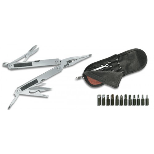 Fishing Tool has locking blades for safety. Tool features bit socket to accept the 12-piece Bit Set with handy storage pouch. Includes 12 bits (3 slotted, 3 Phillips, 6 hex), marlin spike, scissors, wire cutter, longreach needle nose pliers (with crimpers for leaders, stops and sleeves), main blade with serration, Phillips screwdriver, bottle opener, flat blade screwdriver, and bit driver
