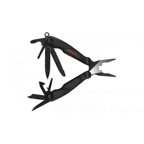 The Coast LED135 multi tool Includes an LED light in the handle, pliers, wire cutter, main knife blade, saw blade, keyring, Phillips screwdriver, bottle opener with flathead screwdriver tip and wire stripper, awl, file with nail pick, can opener with small flathead screwdriver tip.