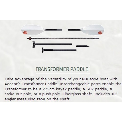 Take advantage of the versatility of your NuCanoe boat with Accent’s Transformer Paddle. Interchangeable parts enable the Transformer to be a 9ft kayak paddle, a SUP paddle, a stake out pole, or a push pole. Fiberglass shaft. Includes 40″ angler measuring tape on the shaft.