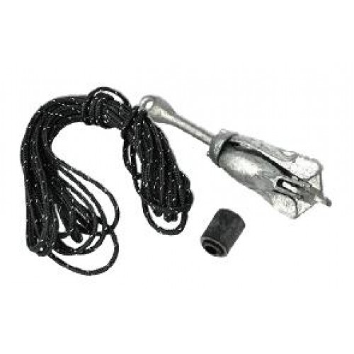 Rubber plug with bushing fits inside transom hole and prevents anchor rope from rubbing on the boat hull. Includes 35’ of ¼” reflective cord and a 3lb galvanized folding anchor.