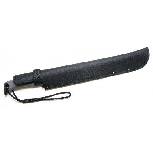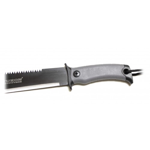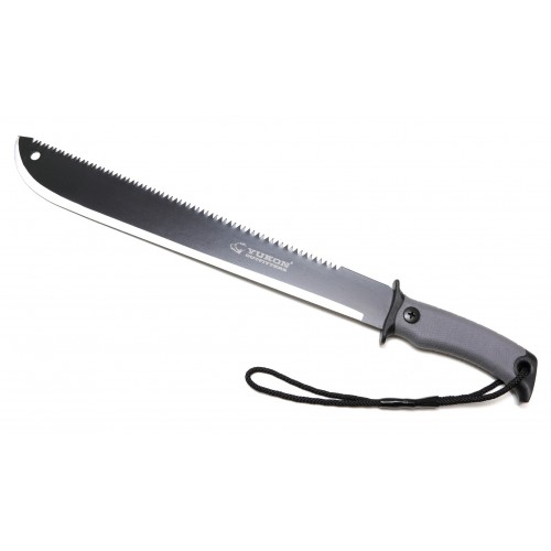 The Yukon Outfitters Survival Machete features a serrated top blade, nylon wrist strap, ergonomic nonslip handle, and a carbide-tipped bottom blade finish. A must have addition to your mission critcal gear. Dual duty, utility and protection.